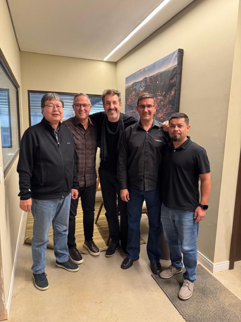Equipe da Scheffer formada por Carlos Taniguchi (Diretor de Operações), Afif Miguel Filho (CEO), Emerson Azevedo (Supervisor de Negócios) e Jeferson Alves (Gerente de Projetos) com Alê Costa, CEO e fundador da Cacau Show (ao centro): parceria de mais de duas décadas Foto: Divulgação